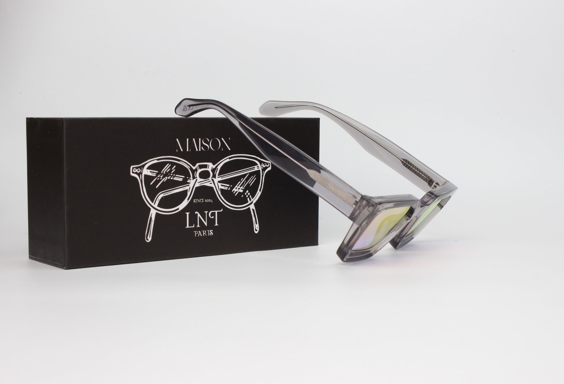 Montures : Forme géométrique octogonale, branches épaisses en acétate transparent gris, avec charnières discrètes.