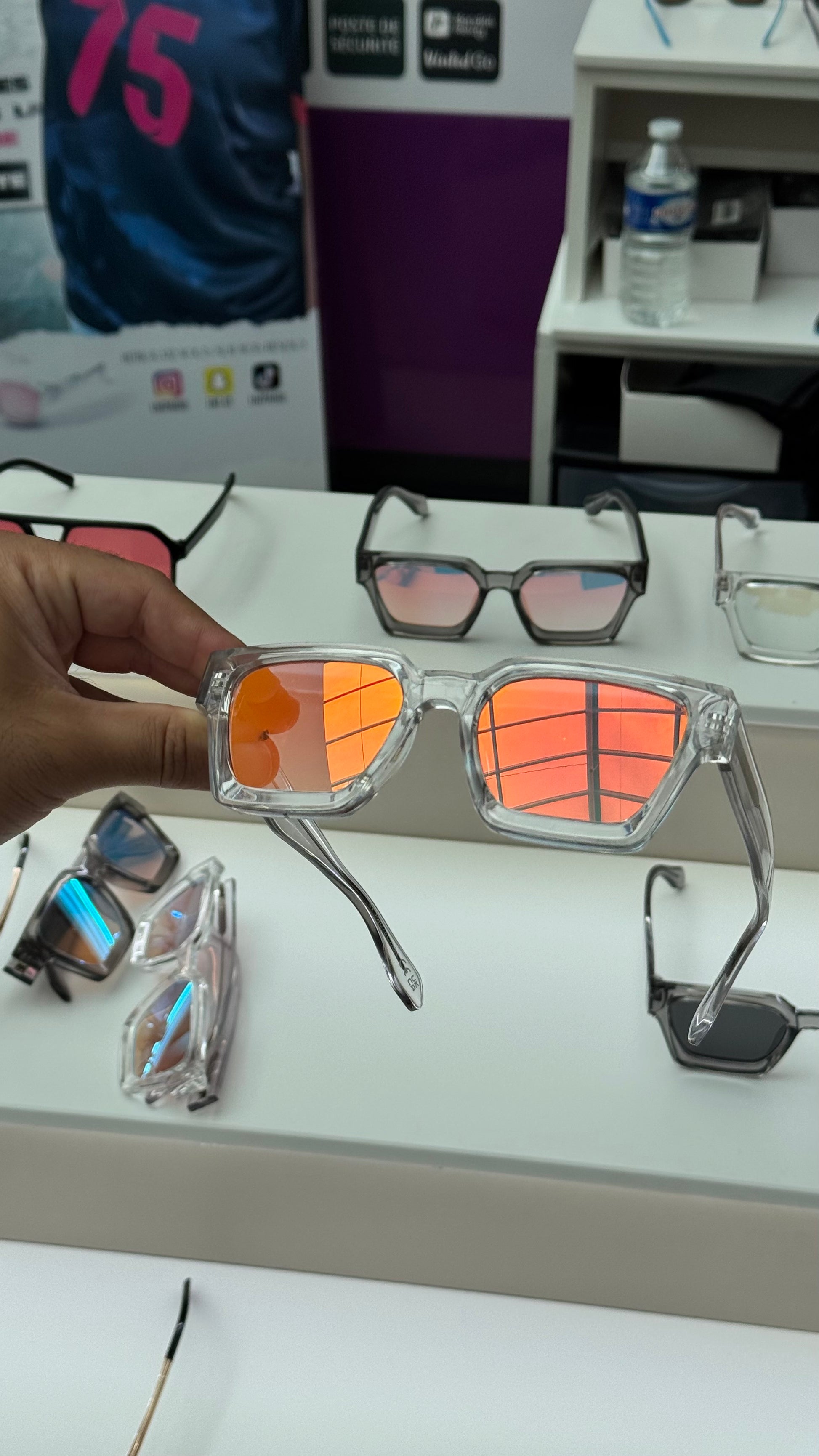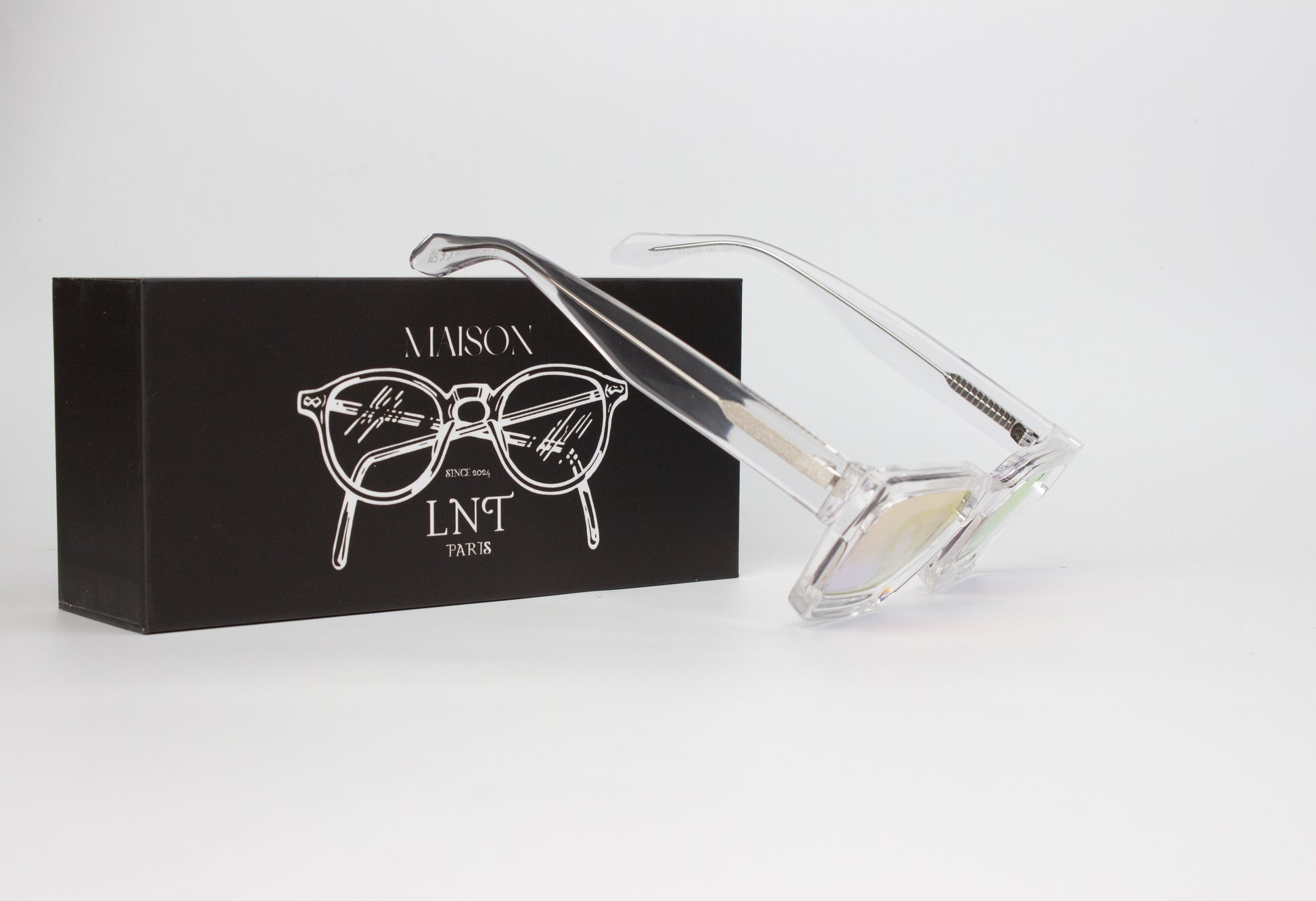Montures : Forme géométrique octogonale, branches épaisses en acétate transparent, avec charnières discrètes.